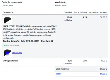 Obtendrás automáticamente un presupuesto del textil con registro de personalización.